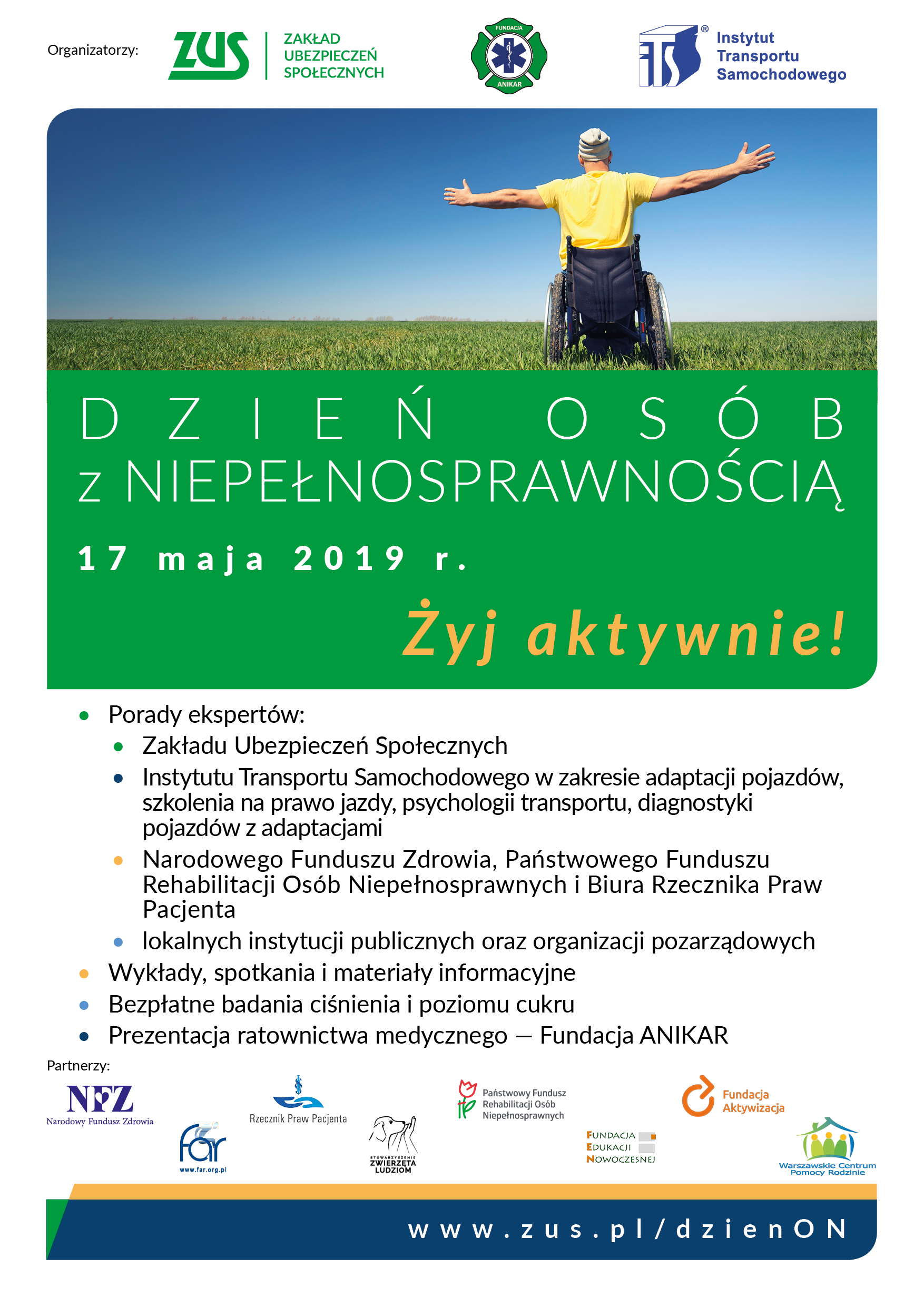 Mieszkańcy Warszawy i okolic mogą przybyć na inaugurację Dnia Osób z Niepełnosprawnością 2019 "Żyj aktywnie!" do siedziby Instytutu Transportu Samochodowego (ITS) przy ulicy Jagiellońskiej 80 w Warszawie. Inauguracja w ITS rozpoczyna się o godz. 10:00 panelem z udziałem przedstawicieli ZUS, NFZ, Biura Rzecznika Praw Pacjenta, PFRON, ITS oraz MIiR. Następnie odbędzie się panel z udziałem osób niepełnosprawnych „Siła jest w każdym z nas”, a w godzinach 10:0-15:00 będą funkcjonować stoiska organizatorów, partnerów i fundacji działających na rzecz osób niepełnosprawnych.