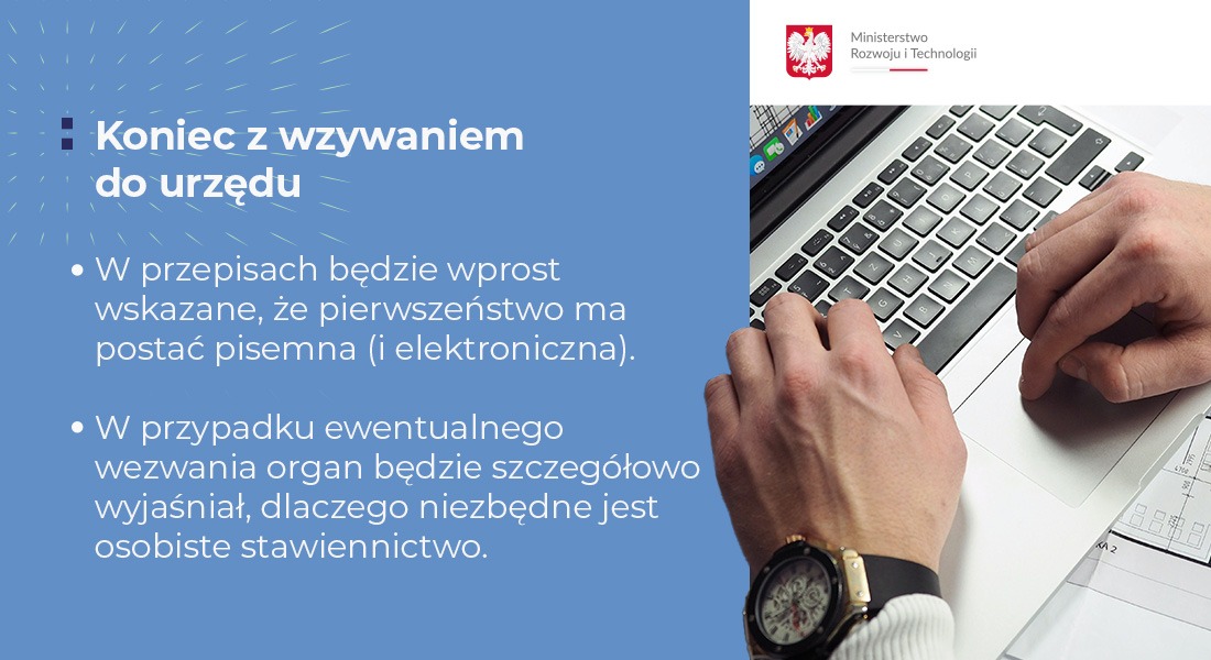 Resort rozwoju dąży do eliminacji zbędnej biurokracji w relacjach państwo-obywatel. W przepisach Kodeksu postepowania administracyjnego i Ordynacji podatkowej będzie wprost wskazane, że pierwszeństwo ma postać pisemna (i elektroniczna). W przypadku ewentualnego wezwania organ będzie szczegółowo wyjaśniał, dlaczego niezbędne jest osobiste stawiennictwo.